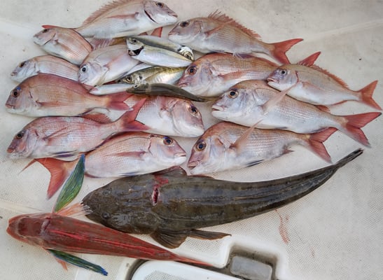 2021年 · 11月 21日, 2021年 11月21日 ドテラ鯛ラバ釣果 今日は鯛&アジ狙いの二点盛りでの出船です。 アジのポイントにはハマチが湧いており、ハマチから逃げているのか 群れの移動がはげしく追いきれませんでした。。。スイマセン(汗) 鯛は小型が多かったですが当たりは多かったです。 シャローエリアのドテラ鯛ラバ、最強です。。。水深15m前後のポイントを流します。。。 70cm近いマゴチやホウボウも混ざりました。 予報よりも風が強く釣りづらかったです。。。 お疲れ様でした。ありがとうございました。 tagPlaceholderカテゴリ: