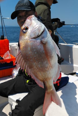終わってみれば鯛は70cmの大鯛を頭に10枚以上釣れました。ラスト2時間、入れ食い状態でした。もちろん全員安打でした。