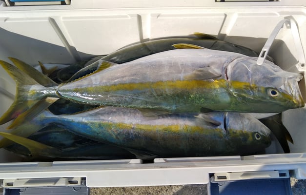 2022年 · 10月 01日, 2022年 10月1日 呑ませ青物 釣果 今日は4名のお客様と吞ませ青物メインでの出船です。 朝一、港の近くで餌のゼンゴアジを釣ってから青物のポイントに直行しました。 吞ませ青物は爆釣で、クーラーボックスにブリ~ハマチが満タンで入らなくなってしまいましたよ。 帰る途中に鯛の熱い反応を見つけたので、タイラバを落としてみたらビンゴでした(笑) 更にアジのポイントでアジを少し釣ってから帰港しました。 お疲れ様でした。ありがとうございました。 tagPlaceholderカテゴリ: