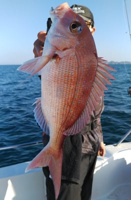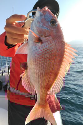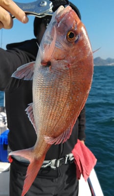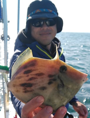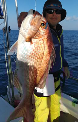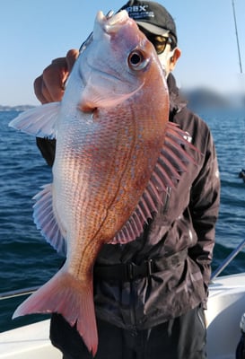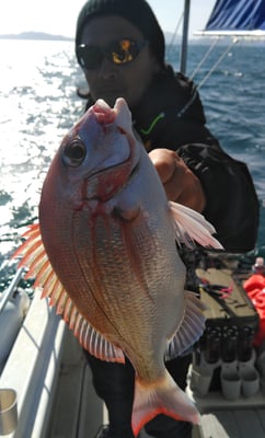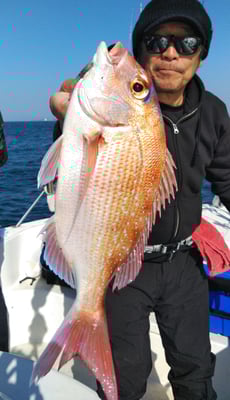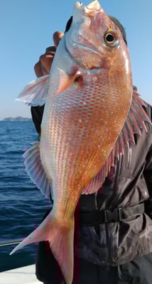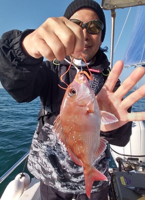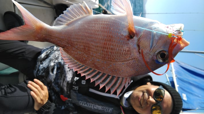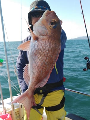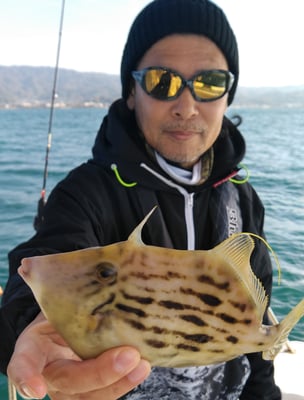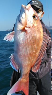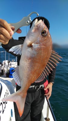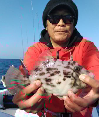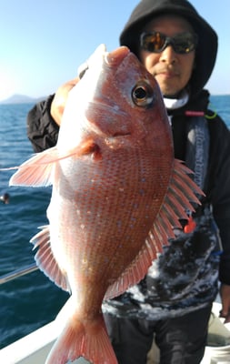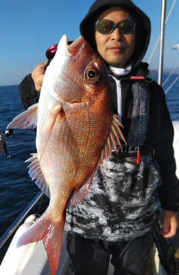 今日は4名のお客様と鯛、丸ハギ、アオリイカ狙いで出船しました