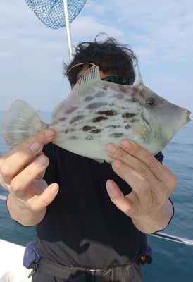 潮が緩んだタイミングでカワハギ狙いに変更。ほぼ潮の流れないなかで、肝頭は7枚。再び恐れ入りました。