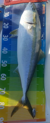 時間はかかりましたが、上がってきたのは90cmのブリでした。PEライン0.6号、リーダーは2.5号だそうです。恐れ入りました。