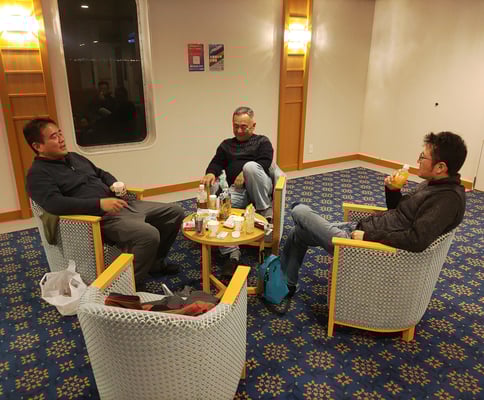 フェリー内で酒盛り、、、もとい、今後の遊漁の方向性などの意見交換をした、、、と思いますw。