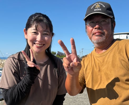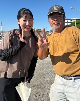 船を片付けていると、テレビ愛媛のHカメラマンと「行ってこうわい愛媛の健診」のCMでおなじみの中山明音アナが、