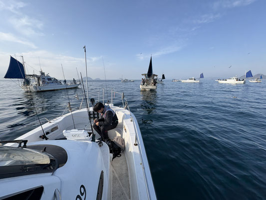 タチウオジギングは皆さん初めてでしたが、手巻きリールで頑張ってもらいました。ポイントは仲間の船で大船団w